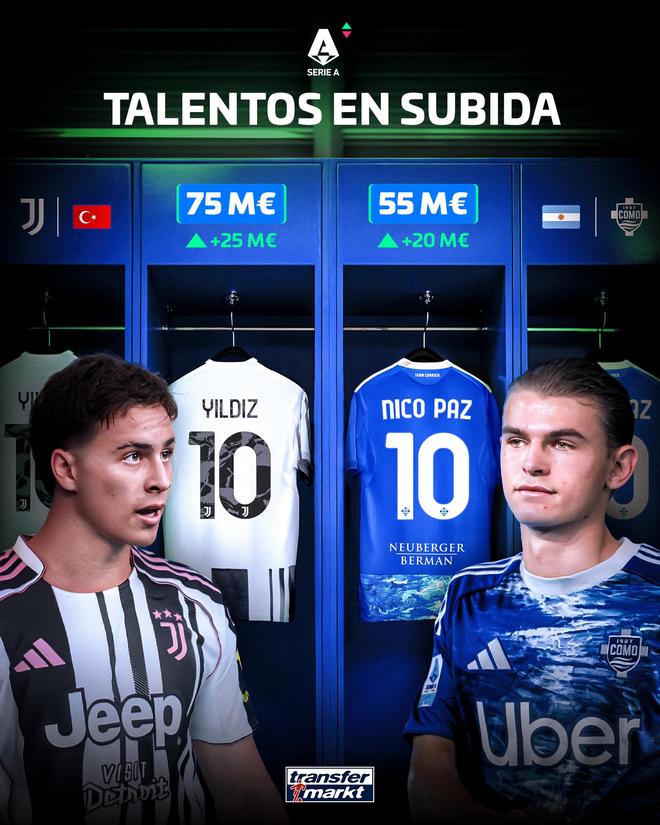 涨幅方面,尤文伊尔迪兹以2500万欧的增长位居涨幅榜榜首,这使得他的身价来到7500万欧,在意甲能排到第三位;科莫妖人帕斯身价也上涨2000万,达到5500万欧,这能排到意甲第八。