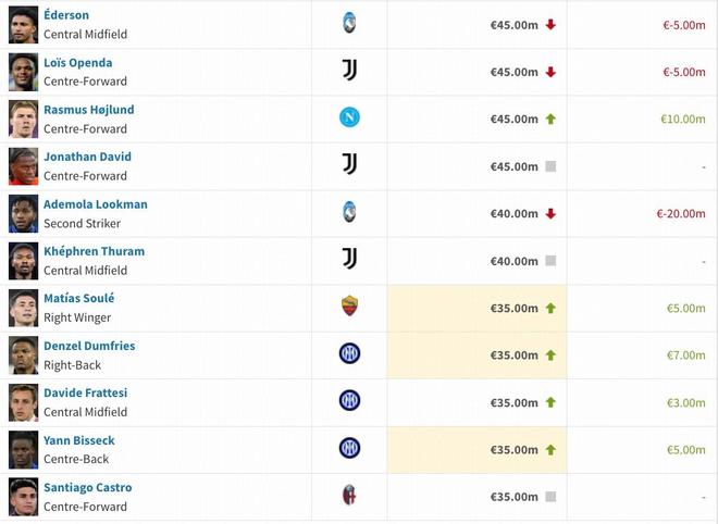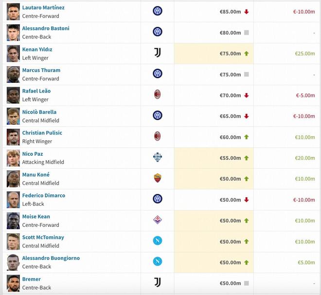 本期德转意甲身价更新中,上涨最多的是尤文新星伊尔迪兹,身价上涨2500万欧,科莫队的尼科-帕斯身价上涨了2000万欧。下跌最多的则是亚特兰大前锋卢克曼,下跌了2000万欧。