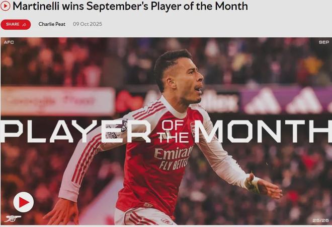 这是马丁内利第五次拿到阿森纳队内月度最佳球员奖,但是2022年1月以来第一次。