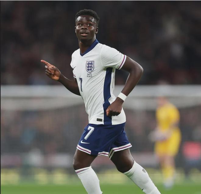 萨卡在英格兰对威尔士的友谊赛中打进了球队的第三球。