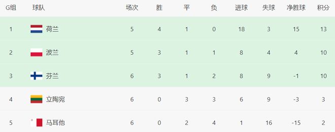 世界杯欧洲预选赛第1阶段的小组赛展开争夺,世界排名第7的荷兰做客挑战马耳他。荷兰在前4场小组赛取得3胜1平的不败战绩。荷兰先是在客场2-0击败芬兰,随后回到主场8-0横扫马耳他,接着在主场和波兰踢成1-1平手,上一场则在客场3-2战胜匈牙利。如今荷兰再次面对小组垫底队马耳他。这场比赛荷兰势在必得。结果,荷兰4球横扫马耳他。