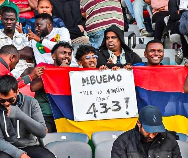 喀麦隆的曼联球迷在看台上打出标语“姆伯莫,和阿莫林谈谈4-3-3!”